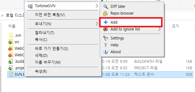 SVN에 추가하고 싶은 대상을 우클릭 - Add