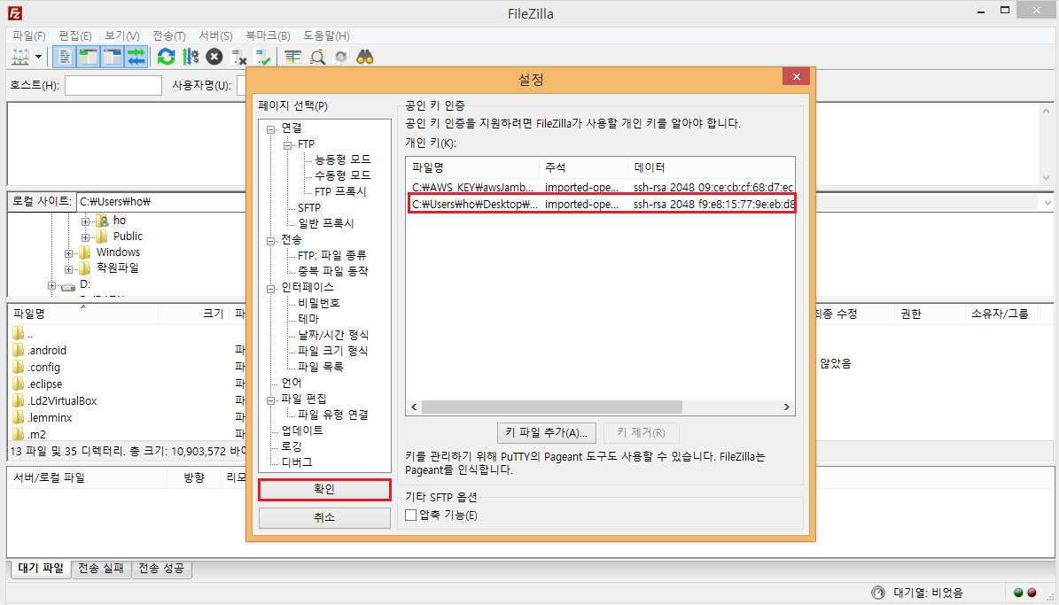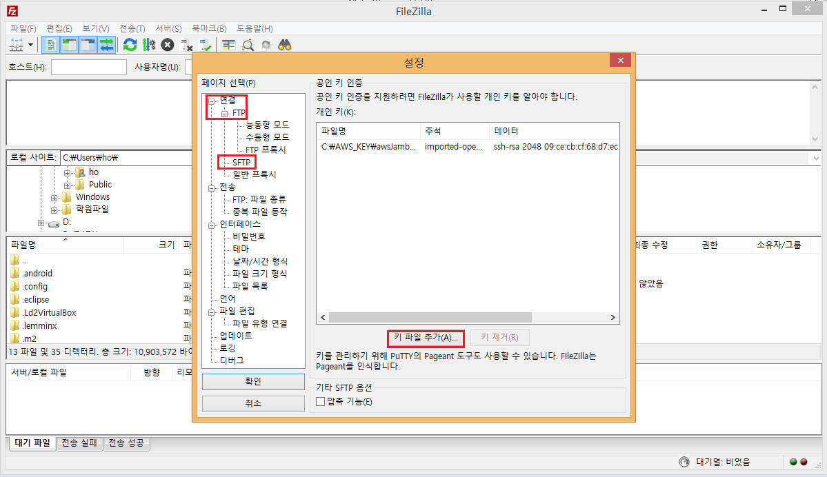 설정 메뉴의 왼쪽에서 [연결-FTP-SFTP]를 순서대로 클릭하여 키 파일을 추가합니다.