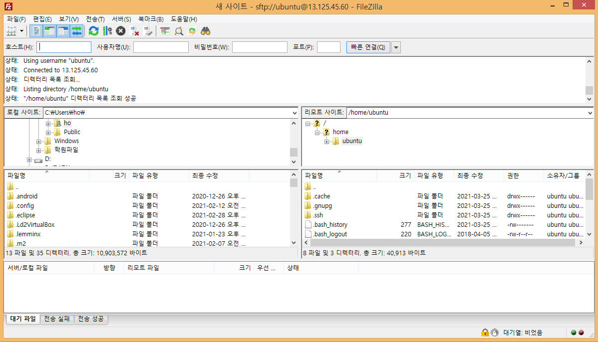 호스트는 퍼블릭 IPv4주소를 입력하며, 사용자이름은 ubuntu 비밀번호는 원하는 비밀번호를 입력합니다.