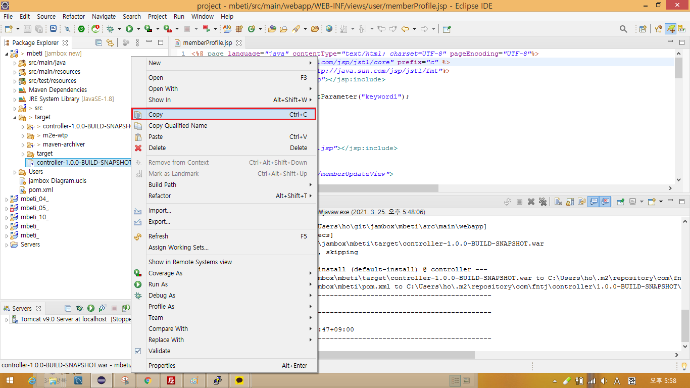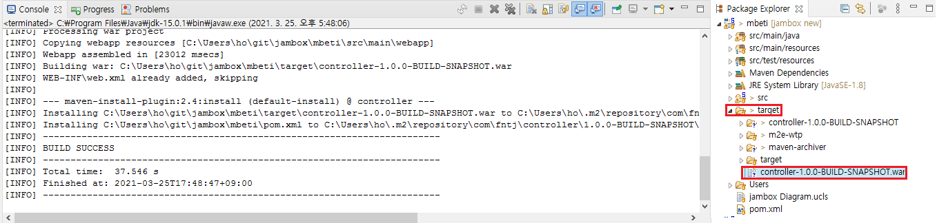 Package Exploler를 보시면 생성된 war 파일을 확인하실 수 있습니다.