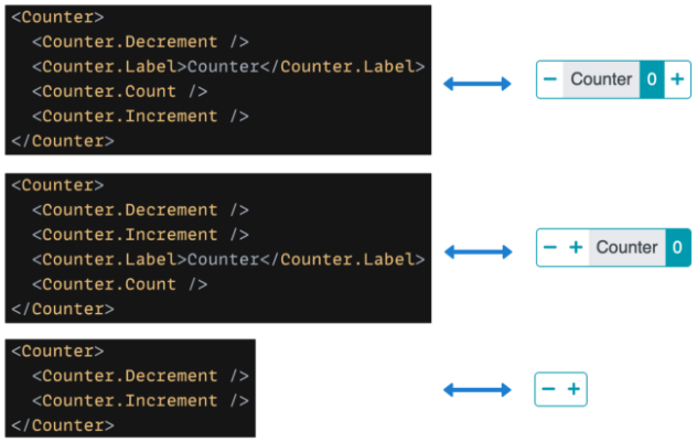 - 유연한 마크업 구조: 컴포넌트의 UI가 뛰어난 유연성을 가지고 있고, 하나의 컴포넌트로부터 다양한 케이스를 생성할 수 있다. 예를 들어, 사용자는 SubComponent의 순서를 변경하거나 이 중에서 무엇을 표시할지 정할 수 있다.