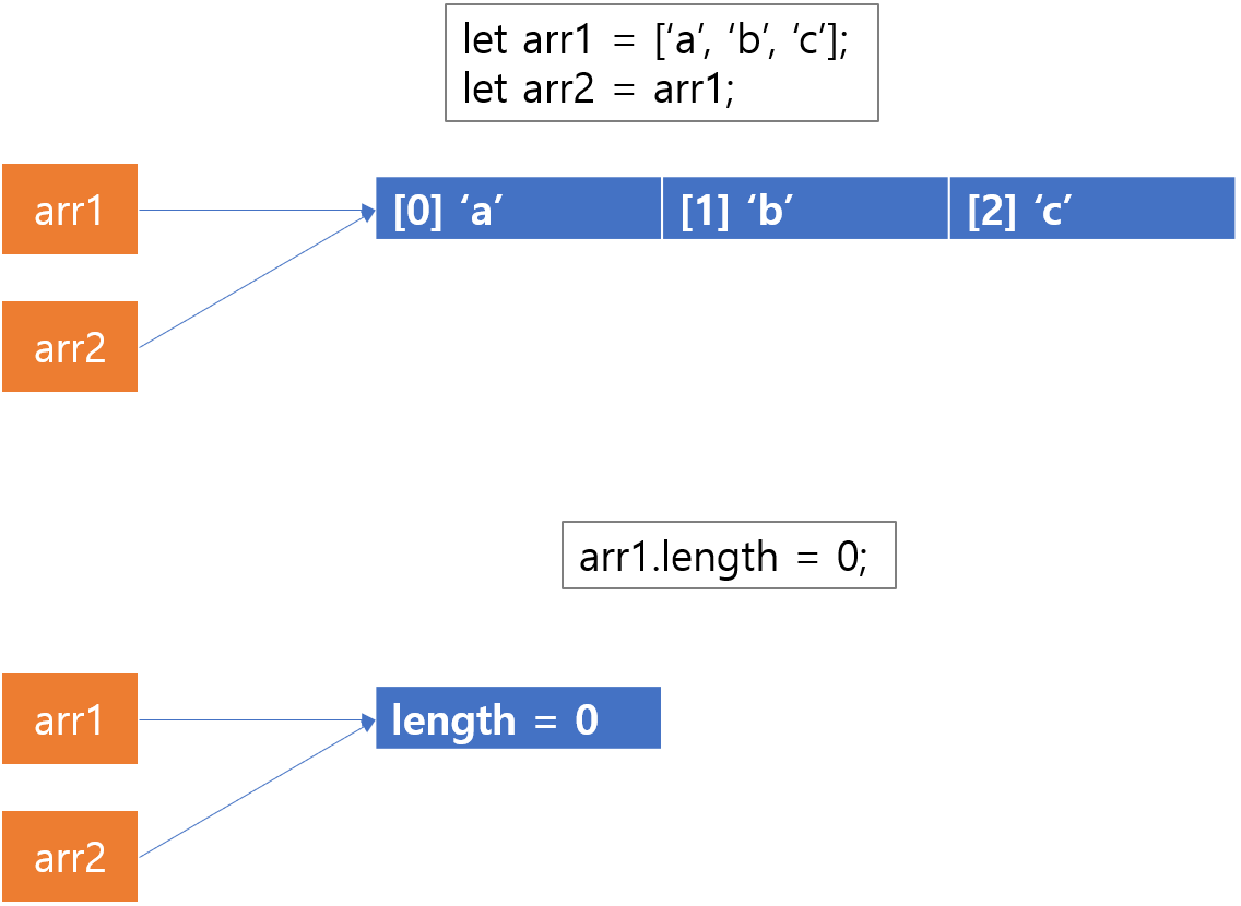 배열의 길이를 0으로 변경하는 경우에는 arr1의 length 값만 0으로 변경하는 것이기 때문에