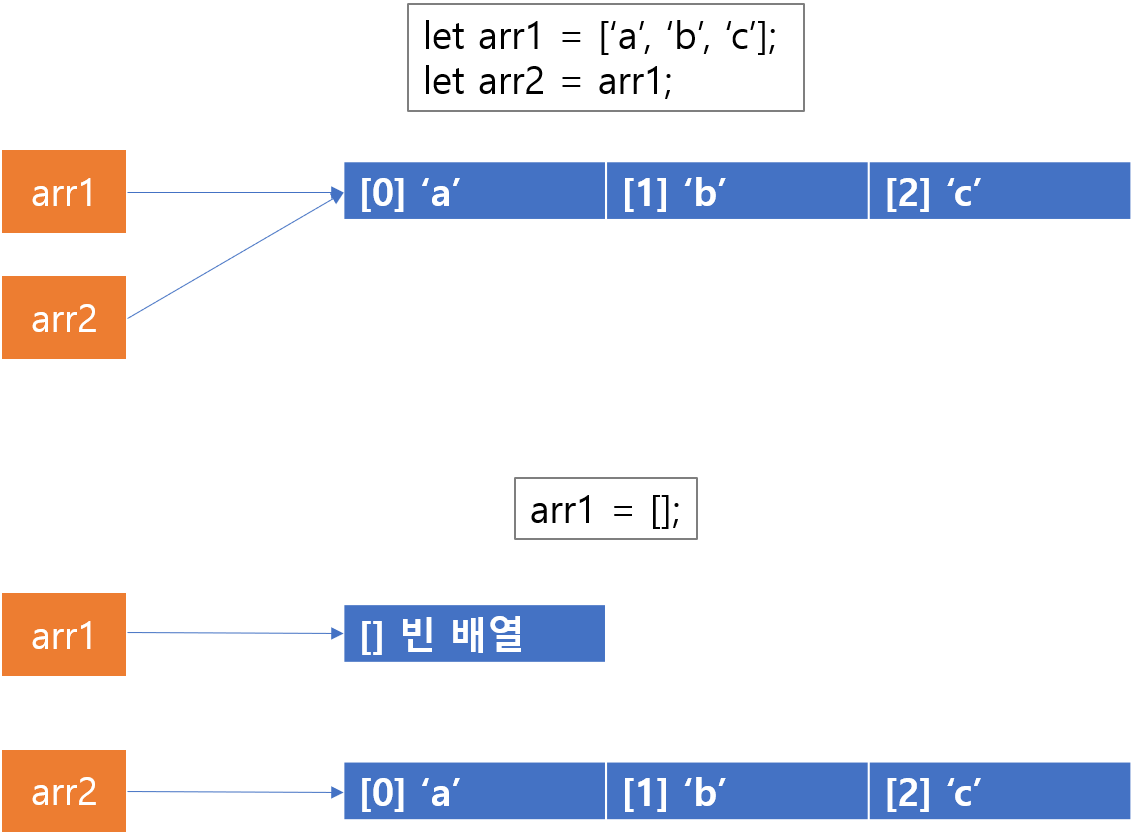 배열에 비어있는 배열을 새로 할당하는 경우 arr1에는 새로운 배열이 할당되지만,