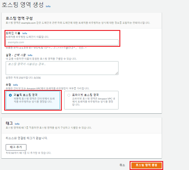 구입한 도메인 주소를 도메인 이름에 입력, 유형은 퍼블릭 호스팅 영역 선택 후 호스팅 영역 생성 클릭
