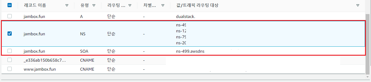 생성된 레코드 중 NS 유형에 존재하는 도메인네임의 값들을 복사합니다.