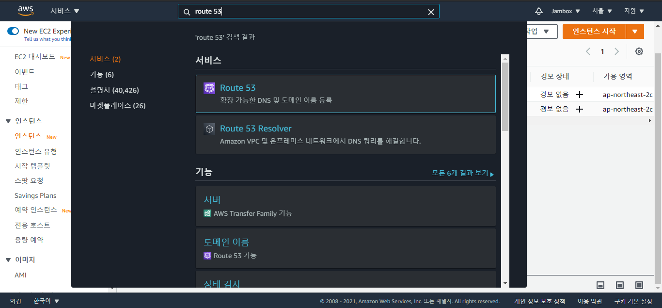 AWS 상당에 route 53 검색하여 해당 서비스로 이동