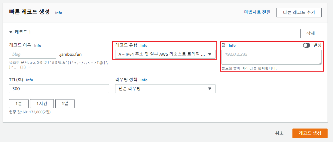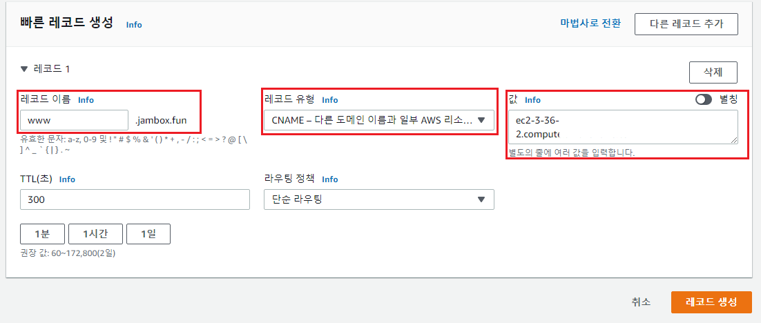 레코드 이름에는 www를 입력하며, 값에는 인스턴스 영역에서 확일할 수 있는 퍼블릭 IPv4 DNS를 입력합니다.