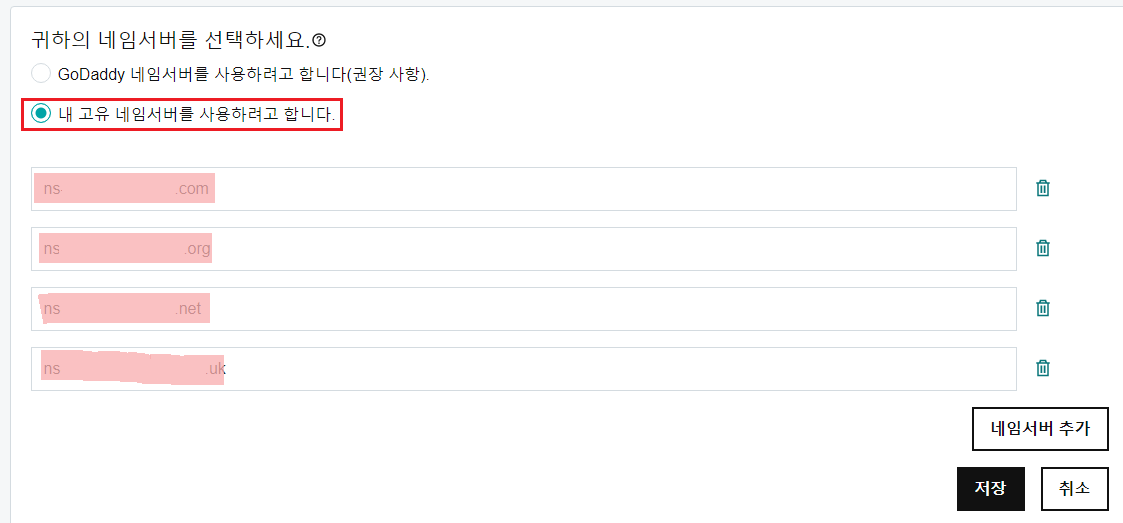 3번에서 복사한 NS 유형의 도메인네임 값들을 붙여넣기 후 저장합니다.