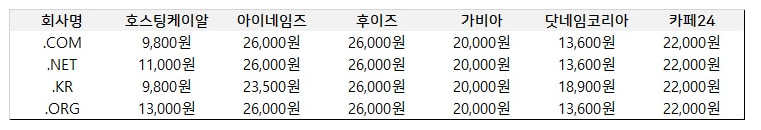 위의 표는 많은 분들이 이용하시는 도메인 업체의 가격 비교 표 입니다.