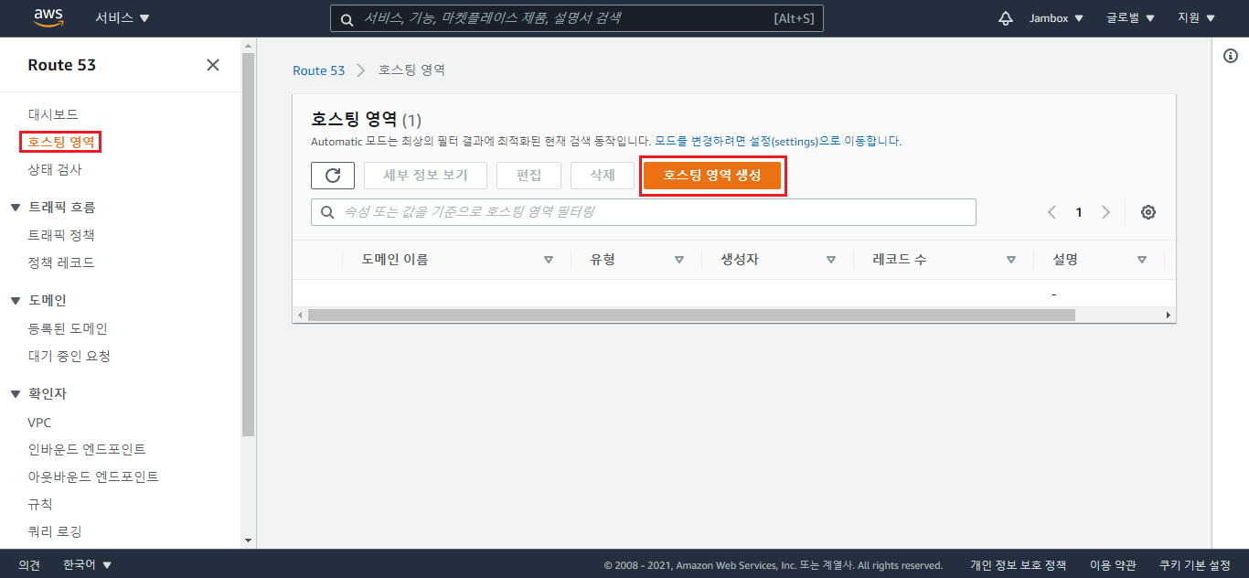 Route 53에서 호스팅영역 선택 후 호스팅 영역 생성 클릭