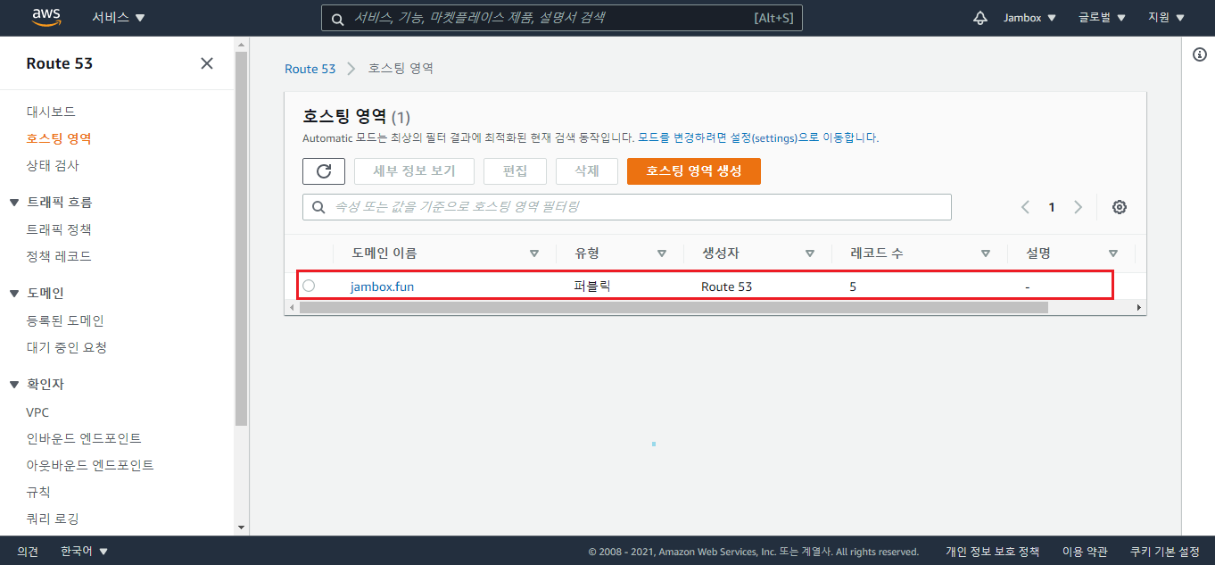 호스팅영역이 생성된 모습을 확인하실 수 있습니다.
