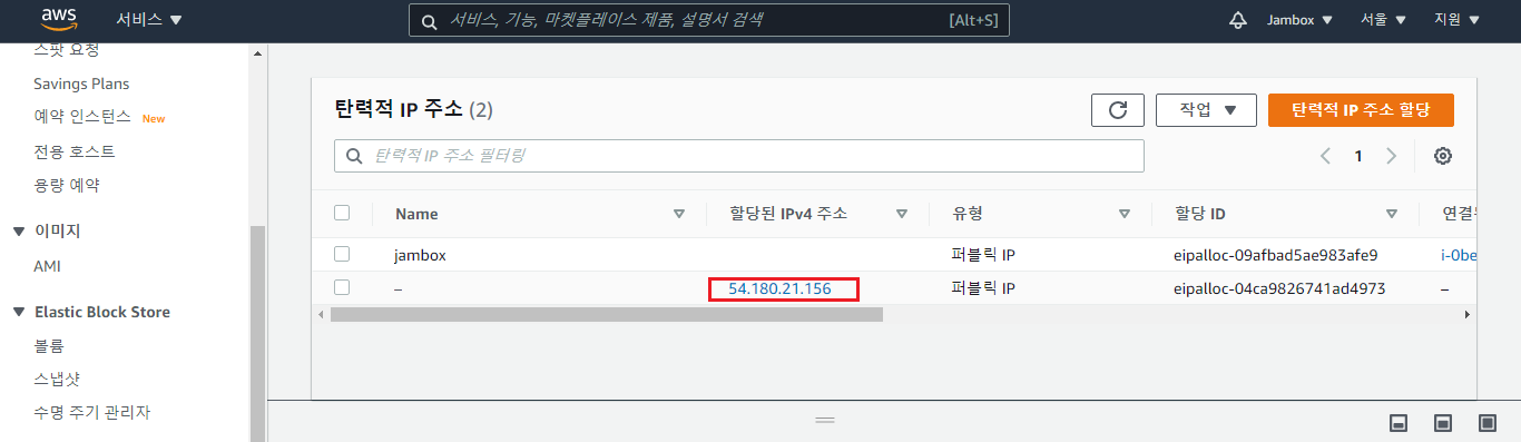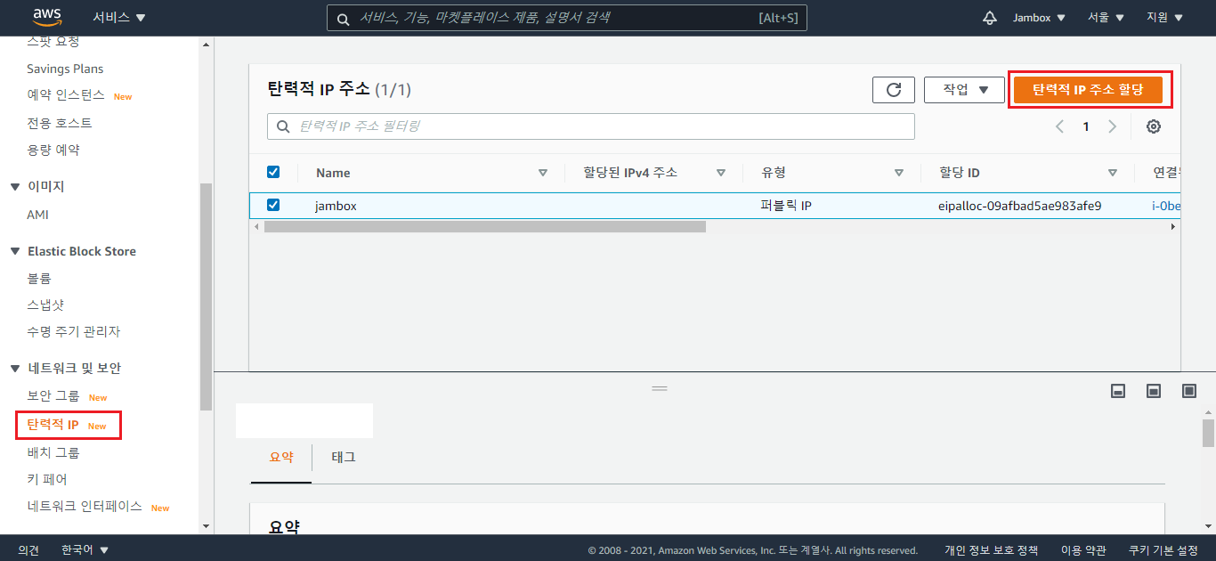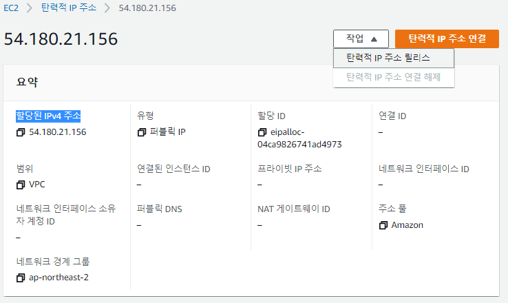 새로운 탄력적 IP가 생성되었고 아래 표시한 부분을 클릭합니다.