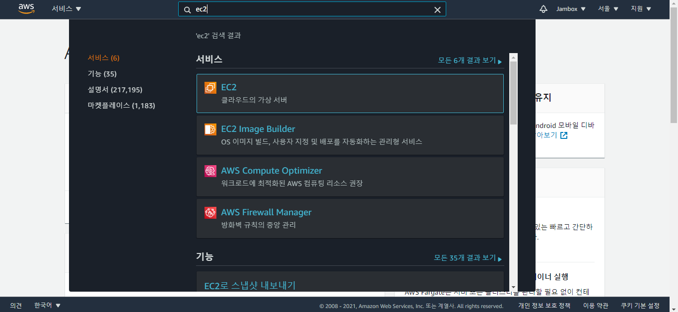 AWS에 접속 후 EC2 서비스로 이동합니다.