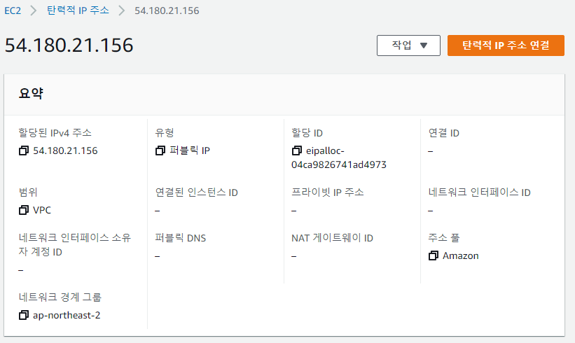 연결을 누르면 탄력적IP가 해당 인스턴스와 연결 됩니다.