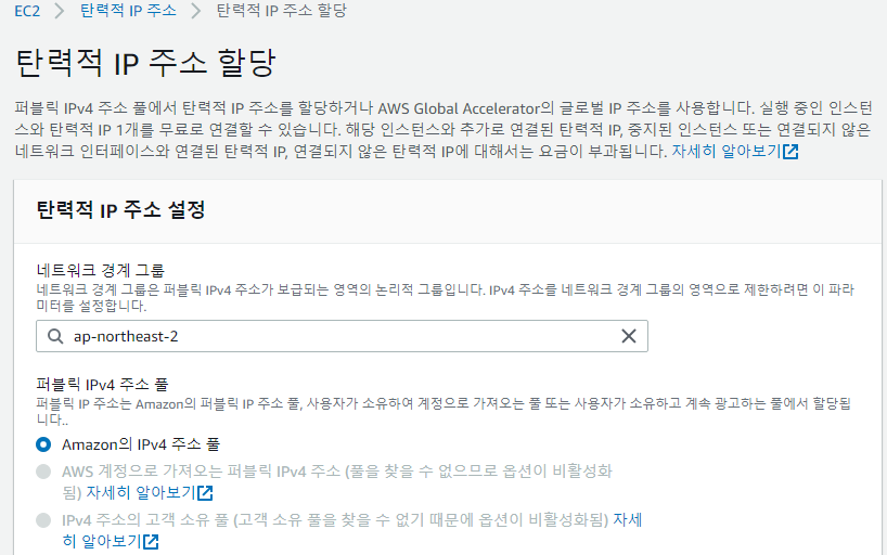 프라이빗IP는 탄력적 IP를 연결할 인스턴스의 프라이빗IP를 입력합니다.