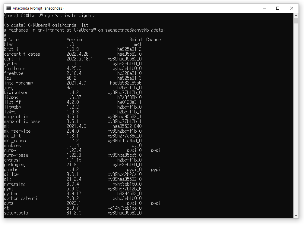 conda list를 입력하여 가상 환경에 설치된 패키지 리스트를 확인한다.