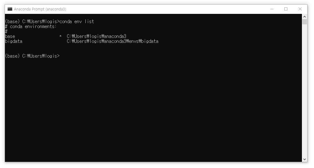 conda env list를 입력하여 생성된 가상 환경 리스트를 확인한다.