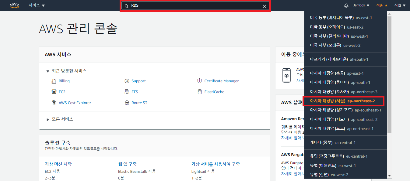 1. AWS 접속 후 지역을 서울로 변경후 검색창에 RDS를 입력하여 RDS서비스로 이동합니다.