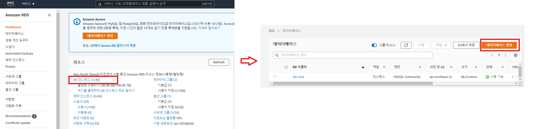 2. [DB인스턴스] 클릭 후 이동된 화면에서 데이터베이스 생성 클릭