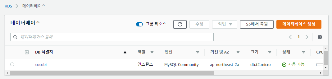 위 이미지대로 설정하신 후 데이터베이스 생성을 클릭하시면 3~5분 경과 후 RDS 생성이 완료됩니다