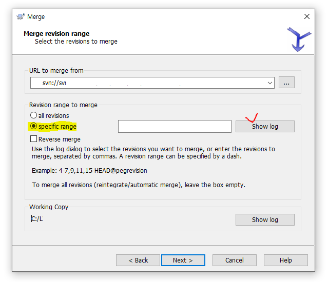 ◾ 기본값으로 Merge a range of revisions가 선택되어 있는 것을 확인 후 Next를 클릭한다.