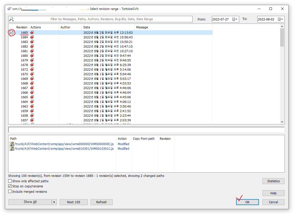 ◾ svn log 창에서 롤백을 원하는 버전을 선택 후 OK 버튼을 클릭한다.