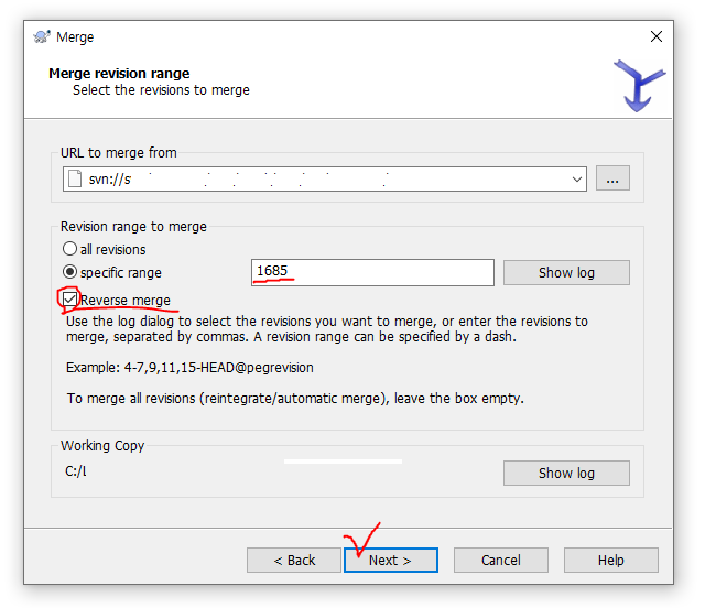 ◾ 위에서 선택한 revision이 range에 잡힌 것을 확인한 후 Reverse merge를 체크하고 Next 버튼을 클릭한다.