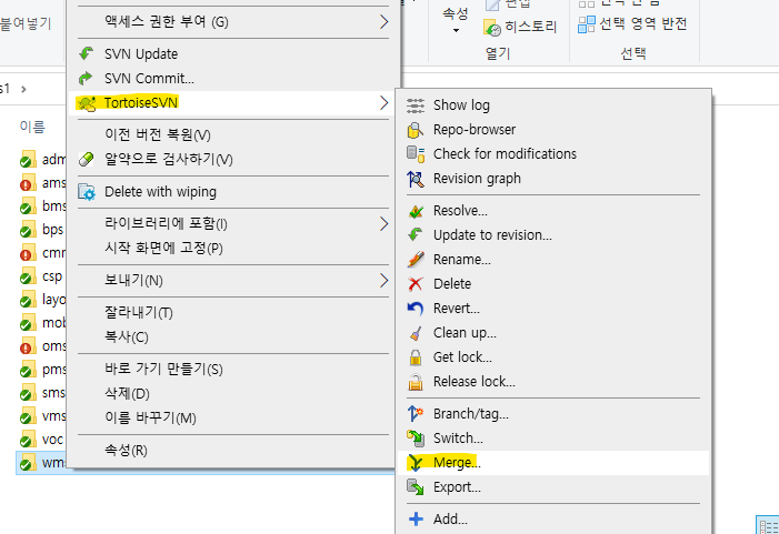◾ revision을 원하는 대상을 우클릭한 후 Merge를 선택한다.