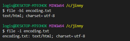따라서 아래의 명령어를 입력하여 현재 파일의 인코딩 정보를 확인한다.