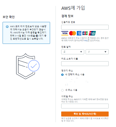 결제 정보를 입력합니다. AWS는 신규 가입시 1년동안 무료사용(프리티어)가 가능하며 1년 경과 후 요금이 부과됩니다.