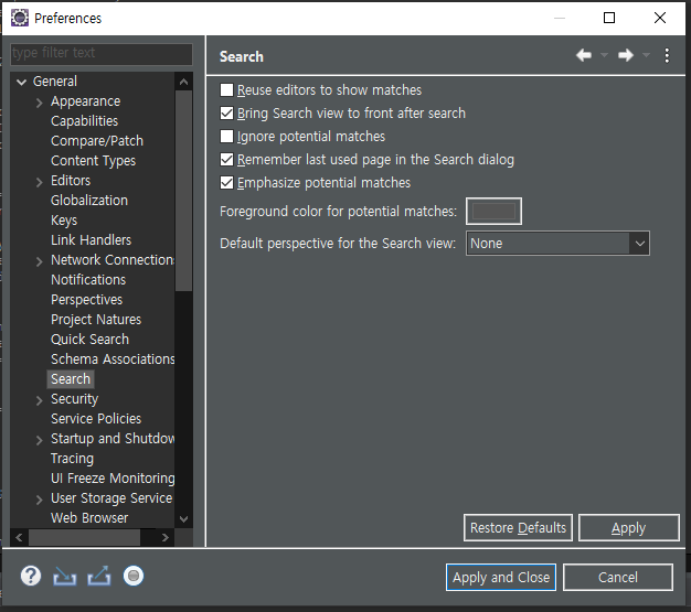 이클립스에서 Ctrl + h 를 통해 파일을 검색하고 해당 파일을 열을 때 기존에 찾은 다른 파일이 열려있다면 해당 파일의 탭에 새로운 파일이 열리게 된다. 이러한 것은 기본 이클립스 설정이 새로운 탭을 열지 않고 기존 탭을 재사용하기 때문이므로 설정을 변경해 주어야 한다.