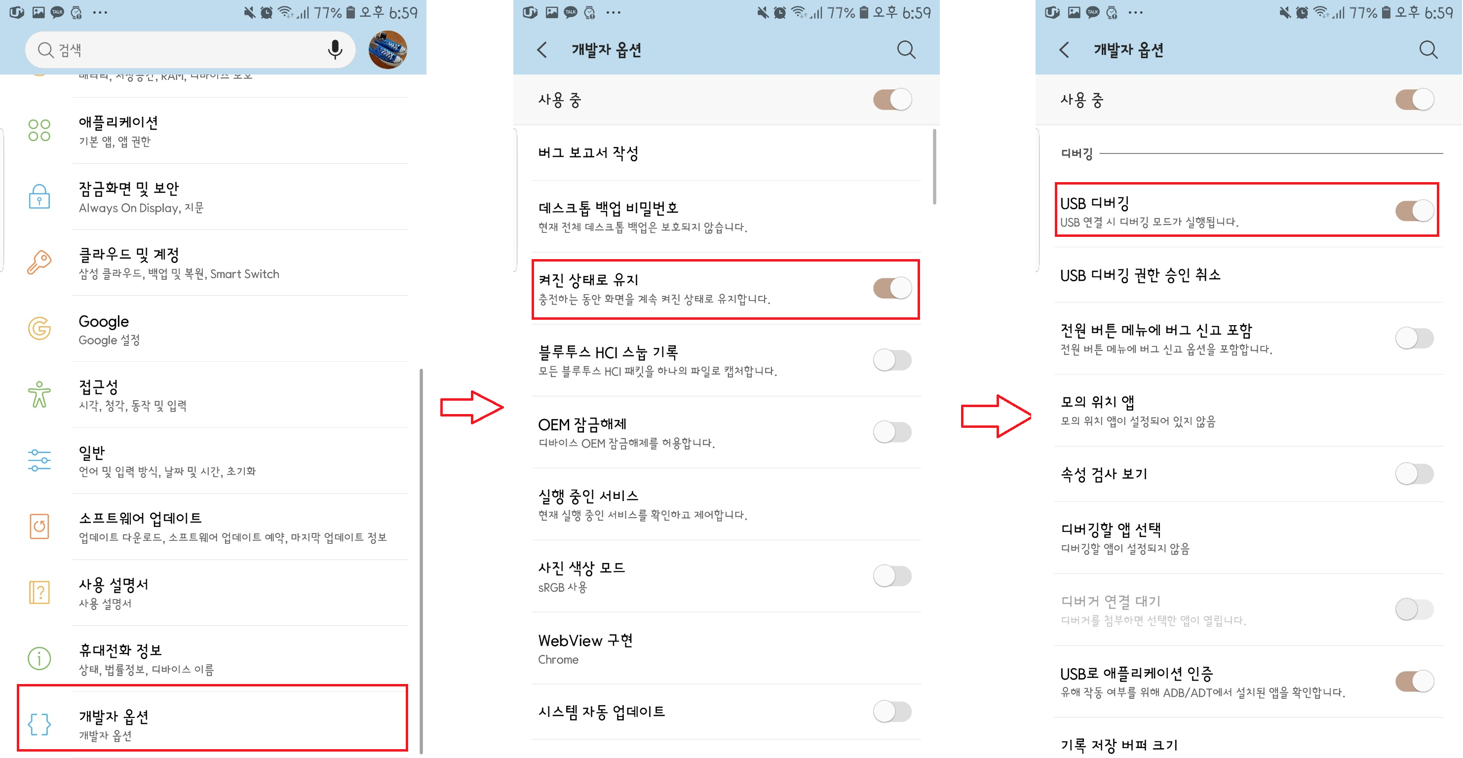 개발자 옵션 → 켜진 상태로 유지 → USB 디버깅