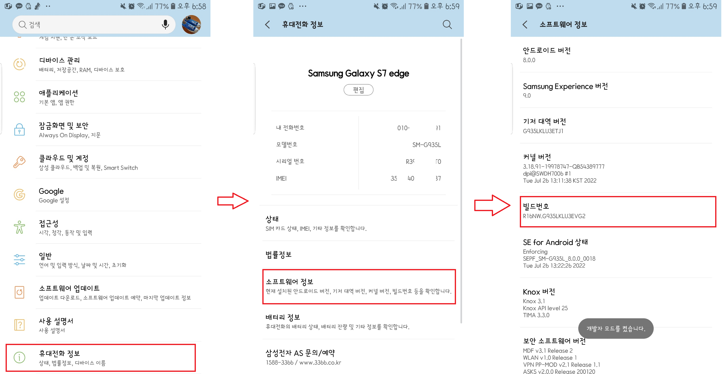 휴대전화 정보 → → 소프트웨어 정보 → 빌드번호 7번 클릭 시 개발자 옵션 메뉴가 보이게 된다.