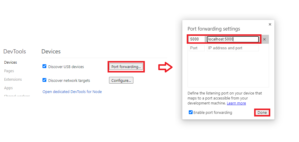 3️⃣ 크롬 개발자 도구 페이지로 이동 및 포트 포워딩