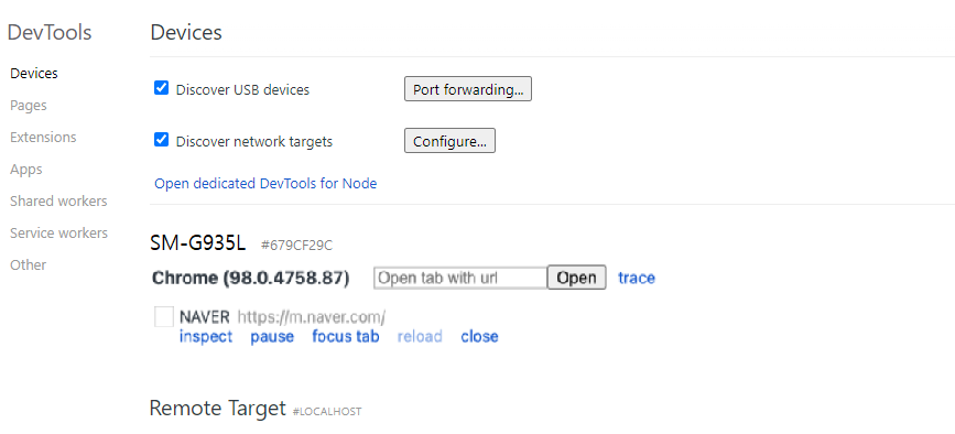 URL에 chrome://inspect/#devices 를 검색하여 개발자 도구 페이지로 이동한다.
