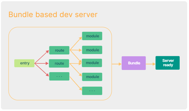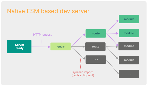 Vite는 ESM 방식을 사용(=브라우저가 필요로 하는 애플리케이션 코드의 일부분만 변환하고 제공)하기 때문에 자바스크립트 코드를 모두 번들할 필요 없이 브라우저에서 자바스크립트 애플리케이션을 작동시킬 수 있다.