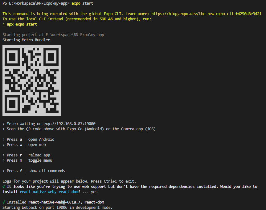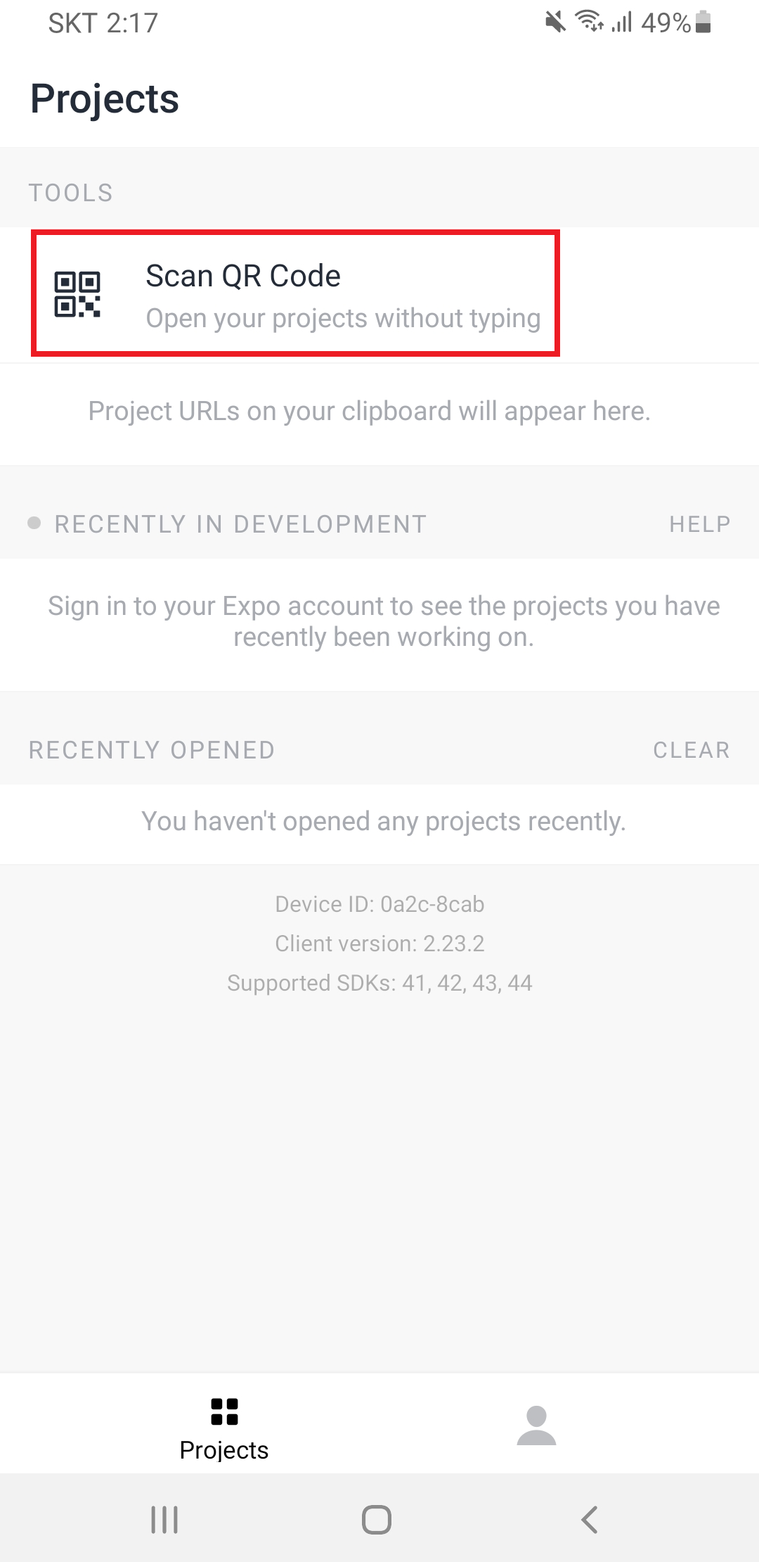◾ Expo app 실행 후 Scan QR Code 선택 → VS Code콘솔의 QR 코드 스캔