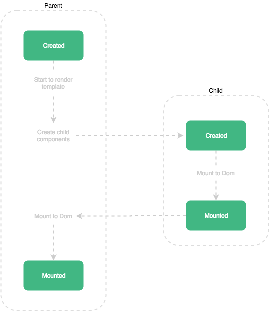 - created 훅은 부모 -> 자식 순으로 호출 되지만, mounted 훅은 자식 -> 부모 순으로 호출됩니다.